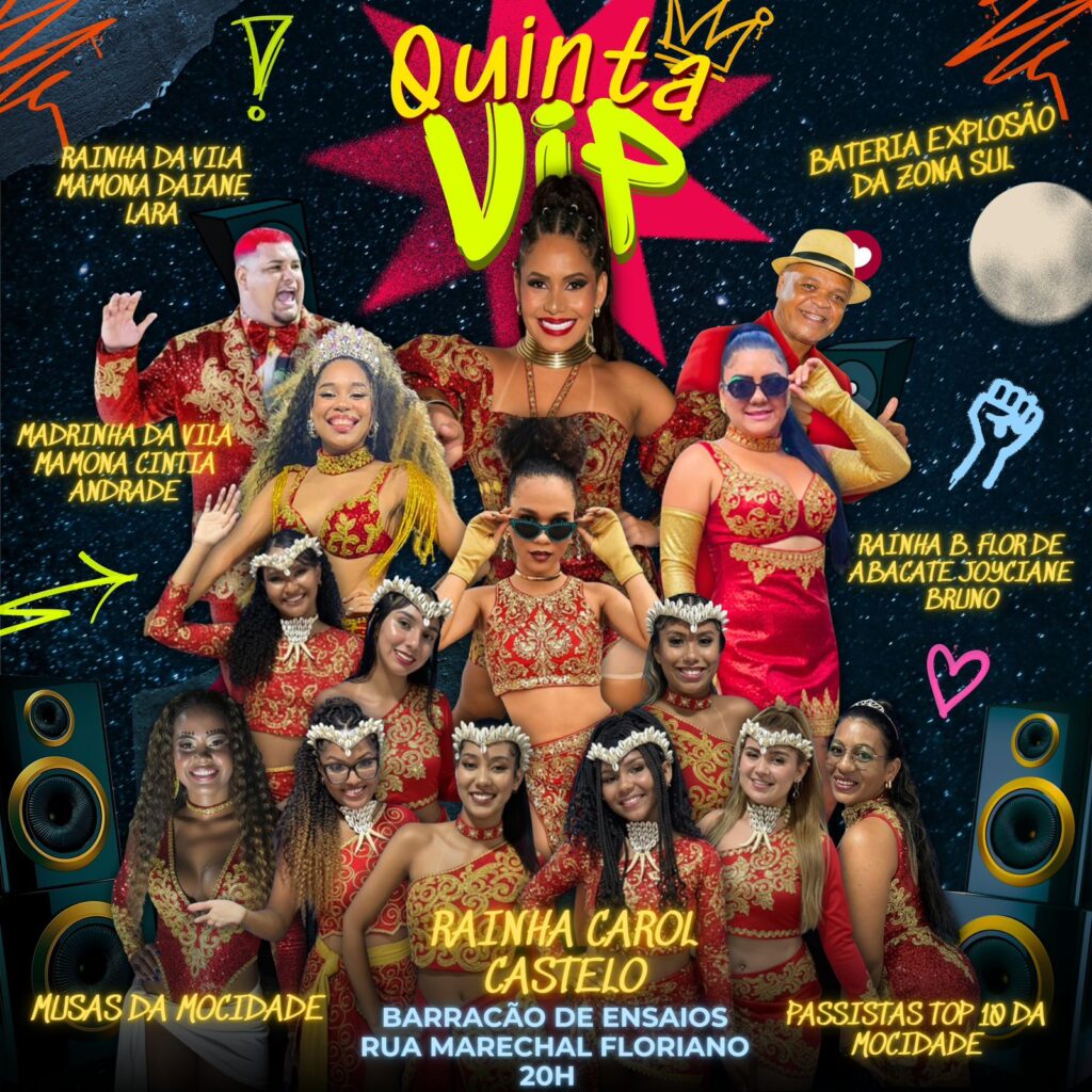 As atrações para anoite de hoje, além do elenco de integrantes da Mocidade, estarão presentes as rainhas de bateria do bloco Flor do Abacate Joyce Bruno e da escola de samba Unidos da Vila Mamona Daiane juntamente com a sua irmã Cíntia Andrade madrinha de bateria da agremiação do bairro Universitário.